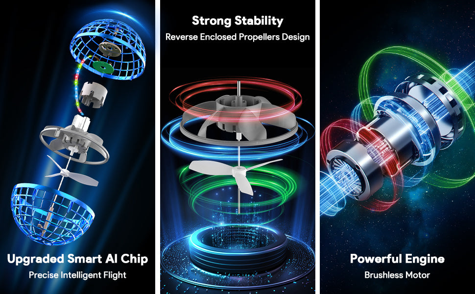 Fabricado con materiales de alta calidad y cuenta con un chip acelerómetro incorporado que detiene el juguete en caso de impacto. La carcasa esférica cerrada está hecha de plástico PP, es elástica y resistente a los impactos. Las palas de la hélice están encerradas en la rejilla con un diseño de densidad razonable. De esta forma, la Flying Ball es flexible, resistente a caídas y puede soportar múltiples impactos. También garantiza su seguridad.
