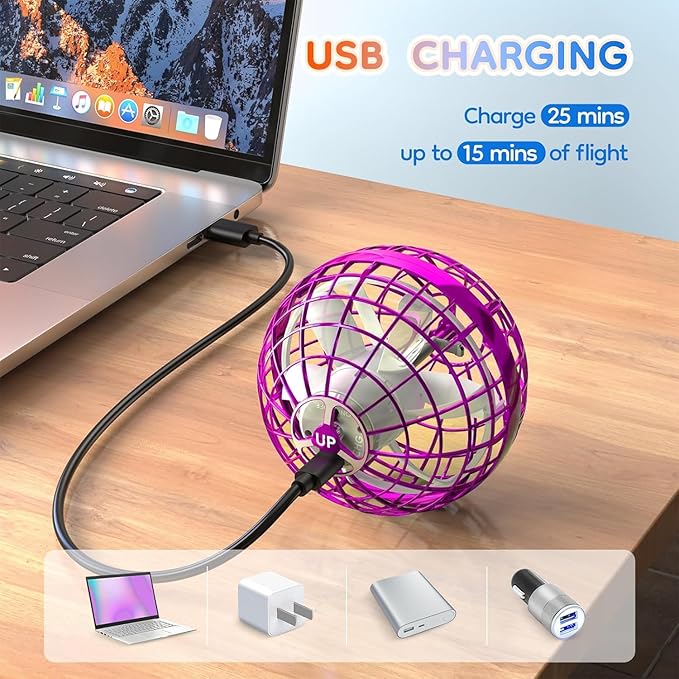 La Pelota Voladora tiene solo 3,4 pulgadas de diámetro y pesa solo 30 gramos, puedes llevarla contigo fácilmente. El juguete viene con una batería recargable incorporada y un cable de carga USB. Se carga rápidamente en 25 minutos y ofrece aproximadamente 10 minutos de tiempo de vuelo. Admite diferentes modos de carga, como adaptadores de batería portátiles, para que no tenga que preocuparse por la duración de la batería.